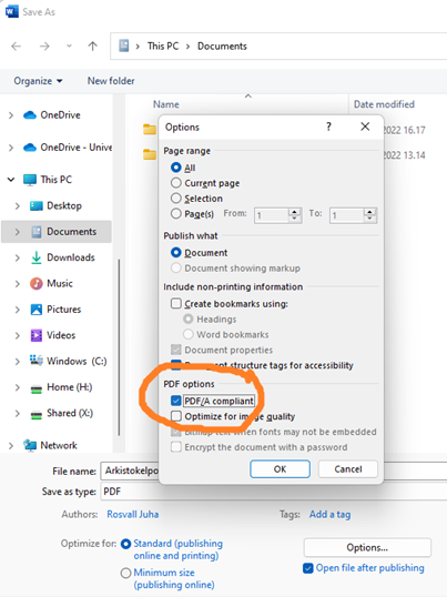 Voit luoda PDF/A-tiedoston esimerkiksi Microsoft Wordilla tai Adobe Acrobat Prolla, jotka ovat käytettävissä Taideyliopiston IT-palveluiden yhteiskäyttöisissä laitteissa (kirjasto, IT-luokka, lainalaitteet).